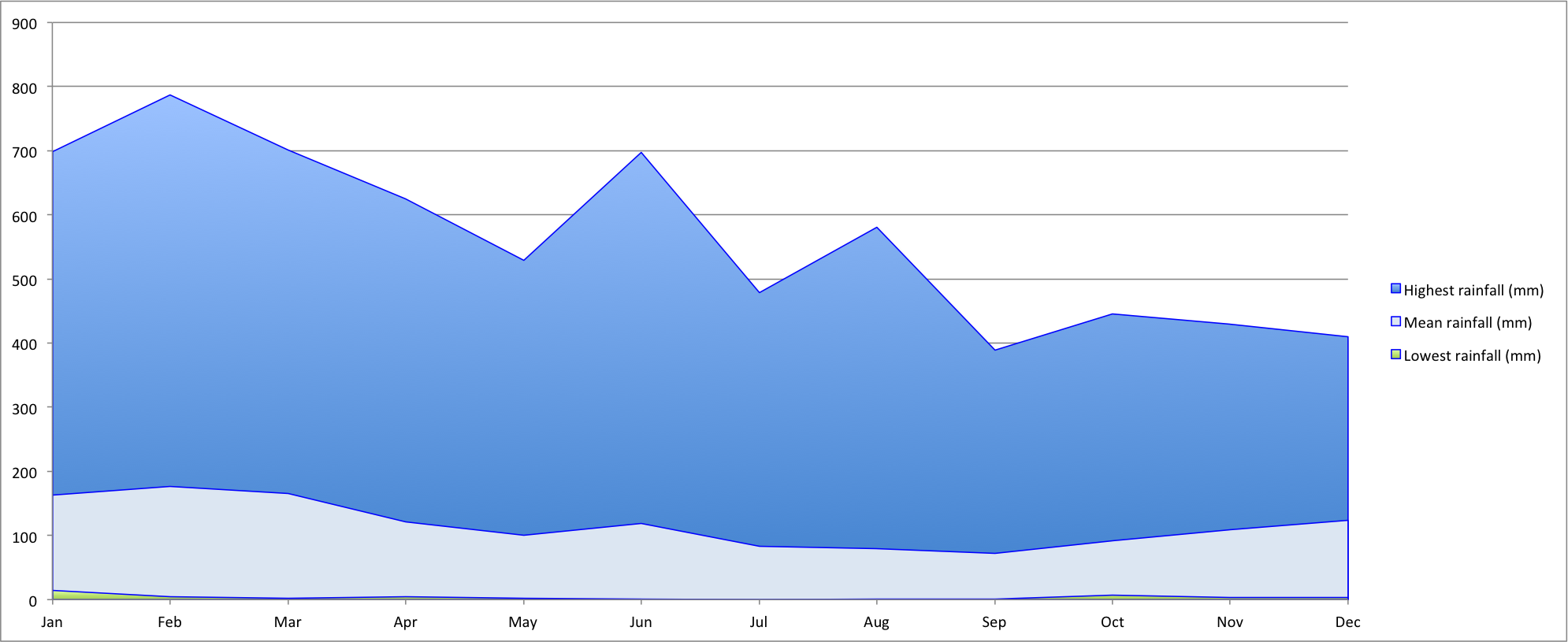 | Highest rainfall (mm) | 698.6 | 787.5 | 701.2 | 624.6 | 529.6 | 696.9 | 478.7 | 580.8 | 389.4 | 445.1 | 429.9 | 410.5 |