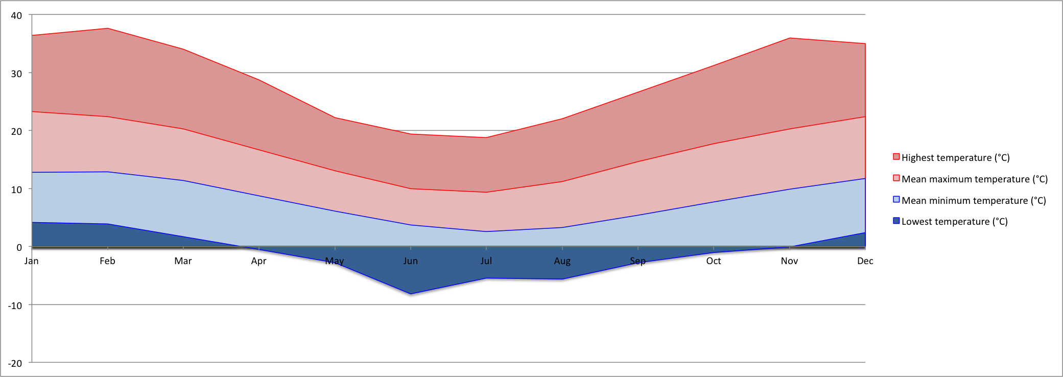 | Mean minimum temperature (°C) | 12.8 | 12.9 | 11.4 | 8.7 | 6.1 | 3.7 | 2.6 | 3.3 | 5.4 | 7.7 | 9.9 | 11.7 |