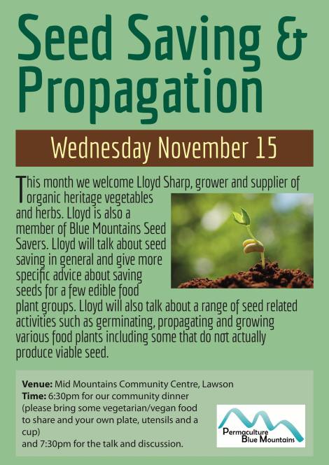A Seed Saving talk coming up tomorrow at the Blue Mountains Permaculture group’s meeting in Lawson by a local Mid Blue Mountains Seed Savers member.
