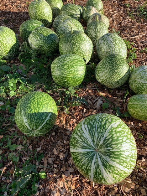 Photo – Some winter melons – Curcubita ficilfolia or ‘Chilacayote’ a very hardy melon that ripens in late Autumn and early winter as the rampant vines die back in the cold.