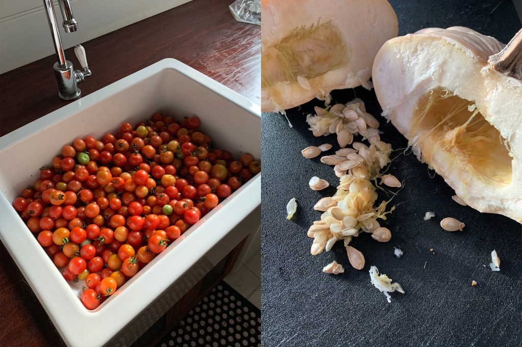 The photo this month is of two typical Autumn activities. As the cold starts to work it’s way through the Mountains and starts to knock back our summer growth we get a lot of work to do saving our seed for next year. Working out what to do with the left over tomatoes can be fun as there are so many ways to preserve them as dried, semi dried, passata or paste. Tomatoes will continue to ripen off the vine if you leave them in a sunny or at least warm spot for a few days. Remember not to refrigerate your fresh tomatoes or you will stop the ripening processes and also generally kill the flavours – they keep much better at room temperature. Remember to set some aside for seed and ferment them for a days in a tall bottle – after about 3 days the good seed always sinks to the bottom. The other fun activity for this time of the year is to break open all your huge seed squash that have ripened over the last of the summer time and now extract the seeds. Not a lot of work is needed and as long as they have been left to harden off for a time in a bright location outside after being separated from the vines – you will find the seed has firmed up and just needs a week or so in a dry location to harden up. They are ready to store and have reached a suitable moisture content when they snap rather than bend. This squash is an old pure White Scallop or ‘Patty Pan’ form – Cucurbita pepo – a traditional type grown for many generations by the first peoples of the US North Eastern region.