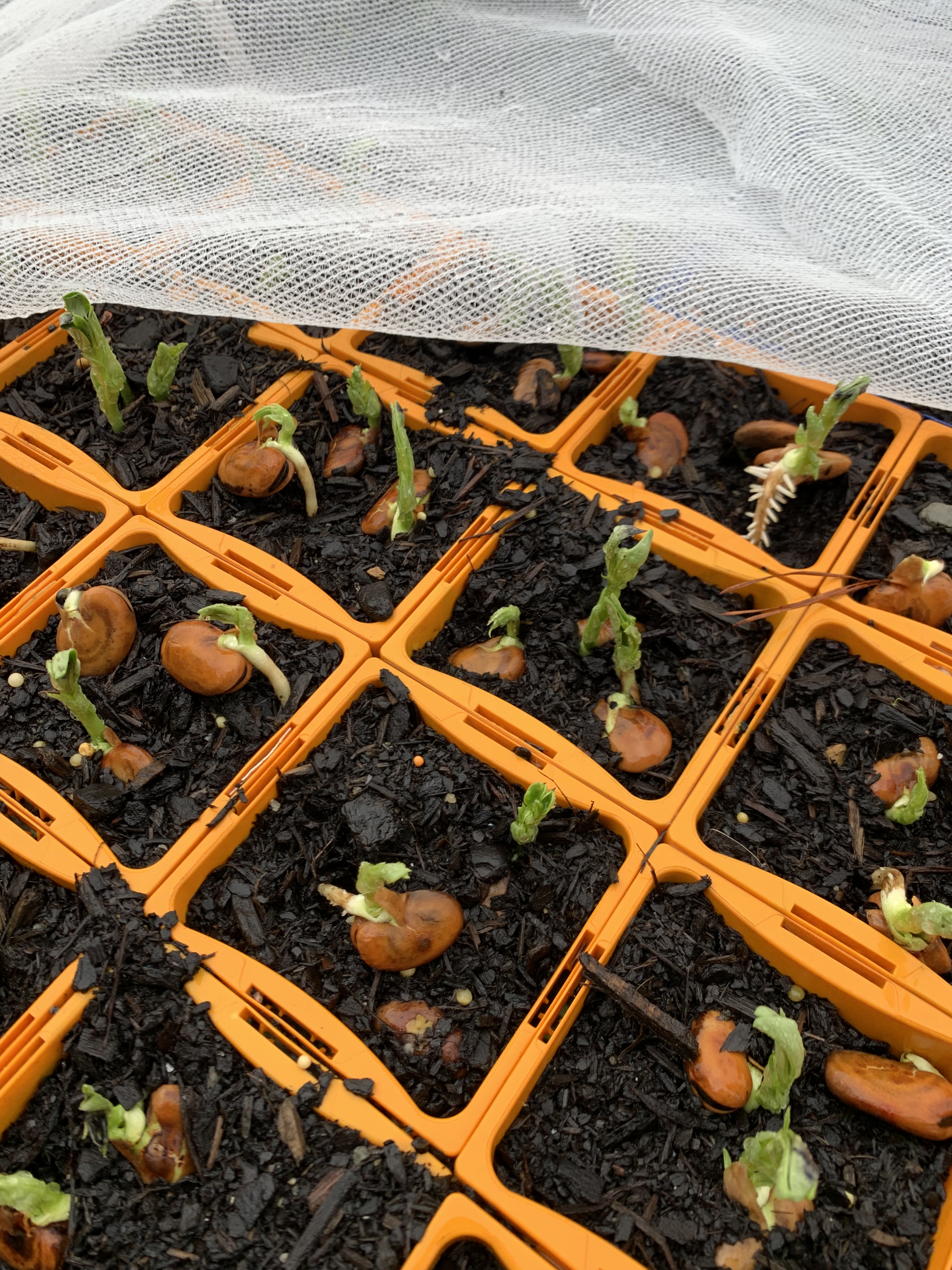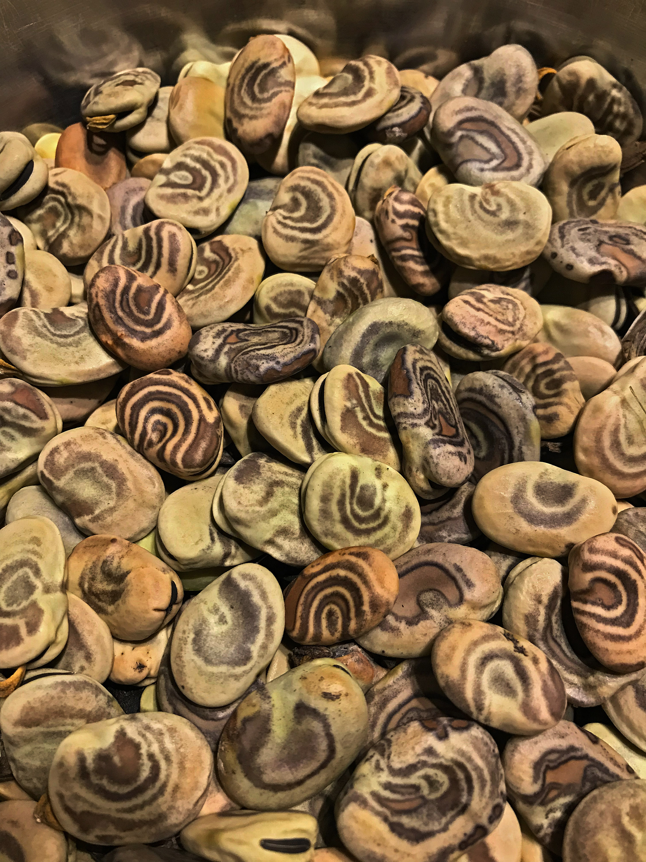 The photo snap this month is of some ‘Stone Ear’ Broad beans (Vicia faba) germinating in the recent VERY wet Blue Mountains weather. These beans can normally germinate and grow in the cold down to about 2c but they don’t really like being wet in the ground and tend to degrade quickly and turn to mush if left in a cold very wet state. You can help them germinate better in wet weather by planting the seeds close to or on top of the soil surface so they get more light and air movement around them. The mesh cloth is there to help protect them from birds, rodents and marsupials who love them. ‘Stone Ear’ one was one of a batch of interesting bean varieties that were ‘rediscovered’ in the Andes during the early to mid 2000’s. They show the development of new varieties in a distinct and remote location. Stone ear has a very intricate pattern of dark lines that form on the surface of the bean when they mature. They have large nicely formed beans that taste great – but only in small numbers of 2-3 beans in small pods. But they are very strong growers and produce a lot of pods on each plant. Broad Beans (aka field beans & horse beans etc) originally came from Europe and were taken to the Andes by early travellers. They then spent the next 300 plus years being grown and selected by local farmers and so developed quite a few unusual unique local varieties with colour patterns on the beans.