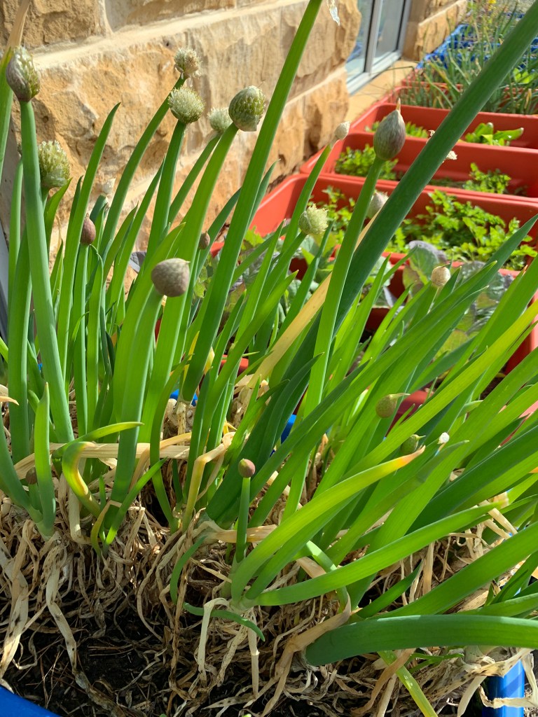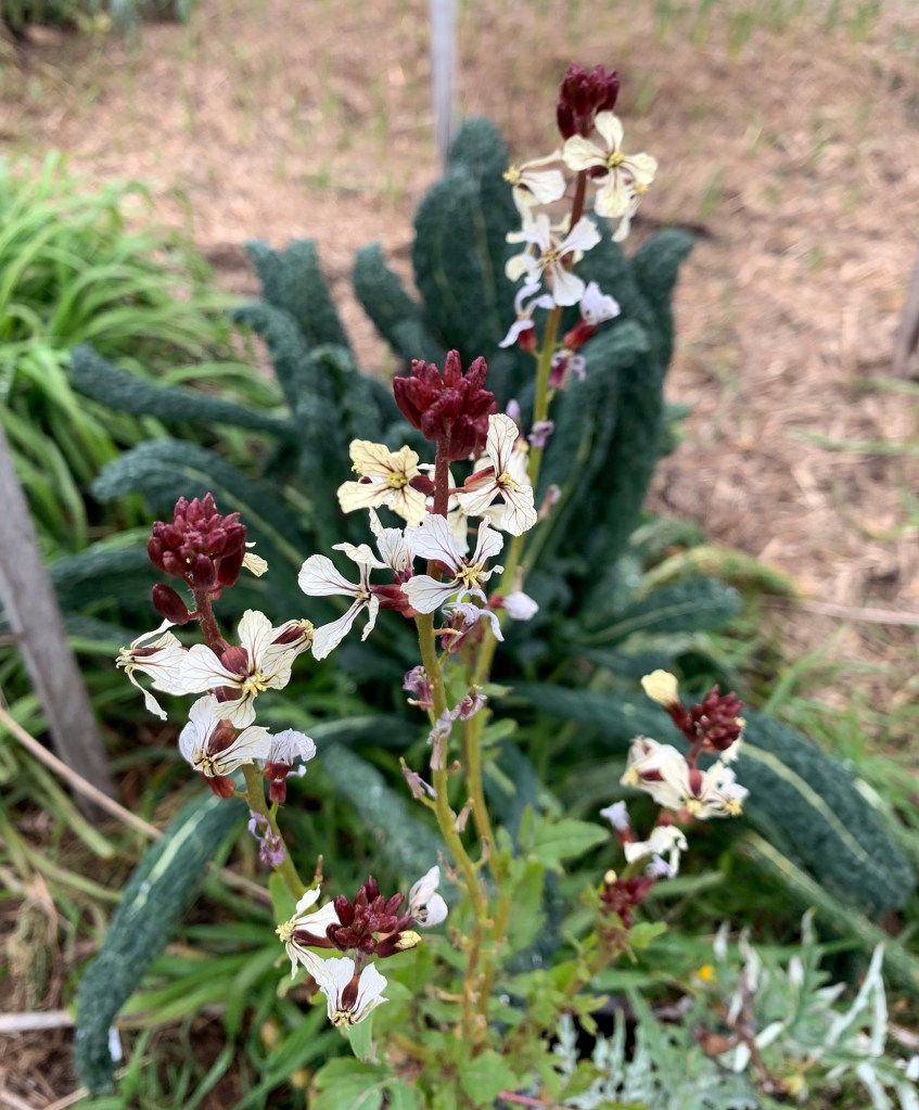 So it’s winter still… it’s been cold – but a fairly congenial cold in the Mountains so far with some nice mild days and cool nights. We start with a photo of rocket (Eruca sativa) flowering – they are great for the bees and pretty tasty. There is a lot to talk about that is happening right now in the garden and it’s a busy process of harvesting new growth, splitting and moving clumps of bulbs and rhizomes, planting out new seedlings and tubers and selecting the seeds for the upcoming spring. You can plant out a lot of seeds at this time by putting them into protected areas in containers and get an early start. The obvious thing is to say there are so many cool weather vegetables that are producing at this time of the year. The whole brassica family is growing and sprouting like crazy – that includes kales, broccoli, cauliflower, mustards like mizuna. The same with lots of other salad and leafy greens like corn salads, spinach and beets. Then there is the onion family that are all starting to sprout again and also send up their productive and attractive spherical seed heads. The garlics will be forming soon after the exposure to the cool winter – they perform best with at least two weeks below 10c and so there is nothing holding them back now. Peas and broad beans are ideal for planting out here now and you can avoid some issues with damping off, insect pests and animals by germinating them on the surface of your soil in containers covered by some netting. They are cool growing plants and will germinate in the open exposed to temperatures right down to about 3c but will obviously germinate faster and more furiously if it’s warmer. And don’t forget to harvest and fertilise your asparagus for this once a year short harvest season.